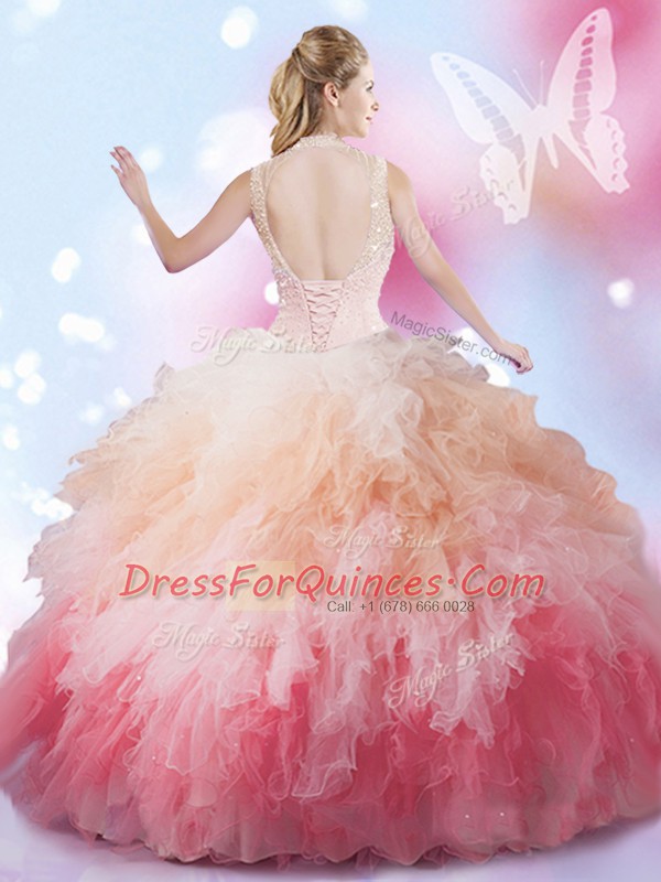 High-neck Sleeveless Tulle Vestidos de Quinceanera Beading and Ruffles Lace Up