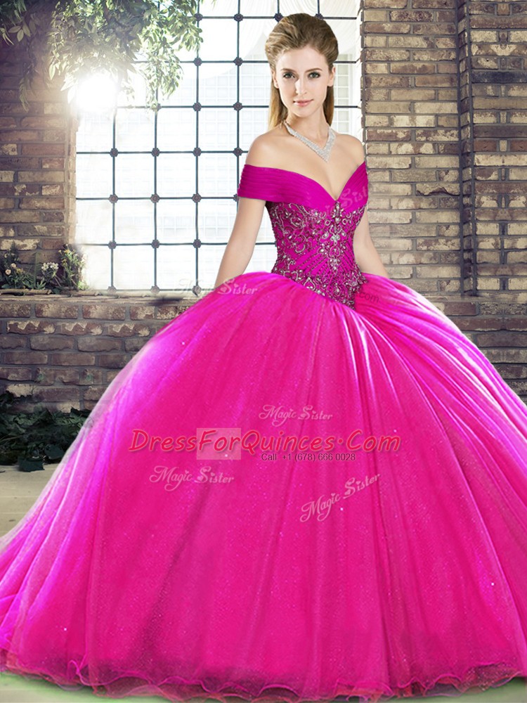 Luxurious Sleeveless Organza Brush Train Lace Up Sweet 16 Dresses in Fuchsia with Beading