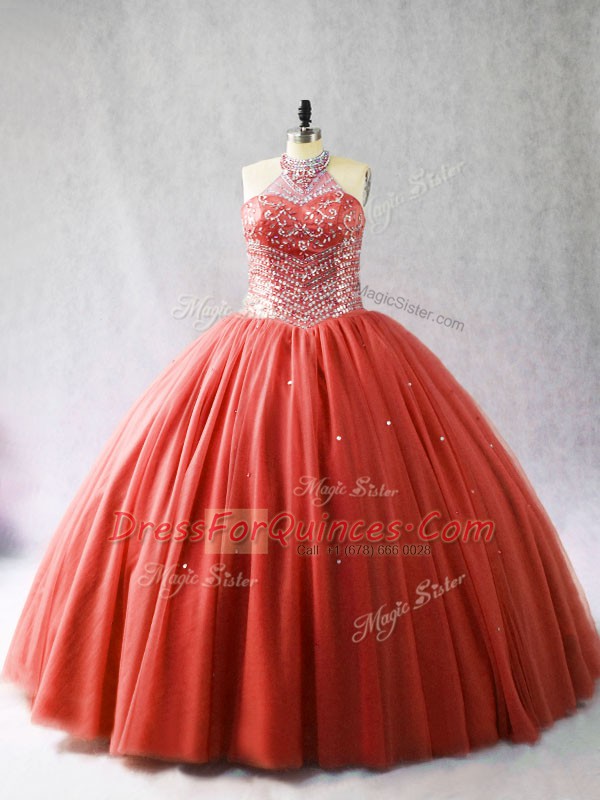 Red Ball Gowns Beading 15 Quinceanera Dress Lace Up Tulle Sleeveless