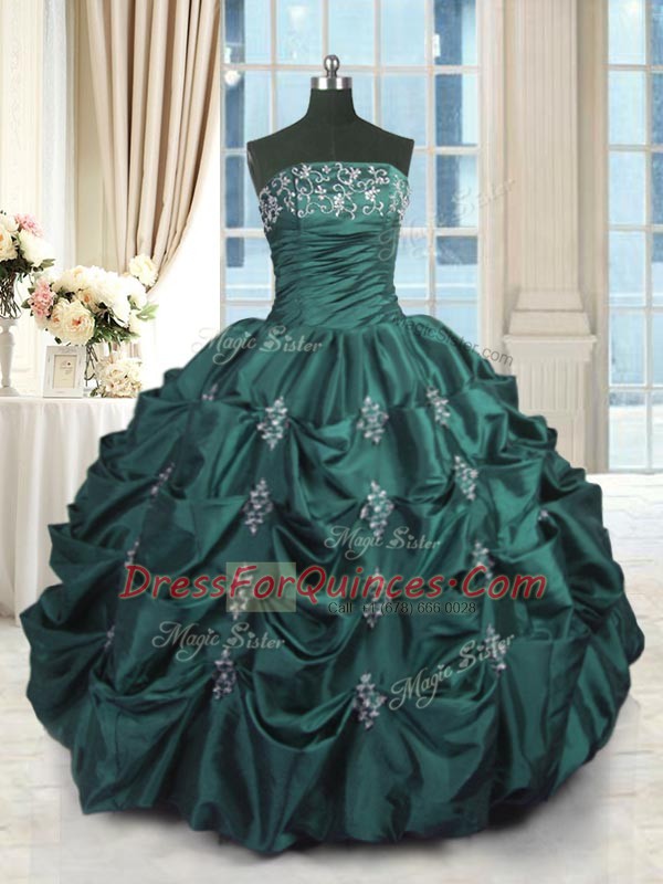 Sleeveless Floor Length Beading and Appliques and Embroidery and Pick Ups Lace Up Sweet 16 Dress with Peacock Green