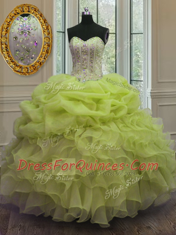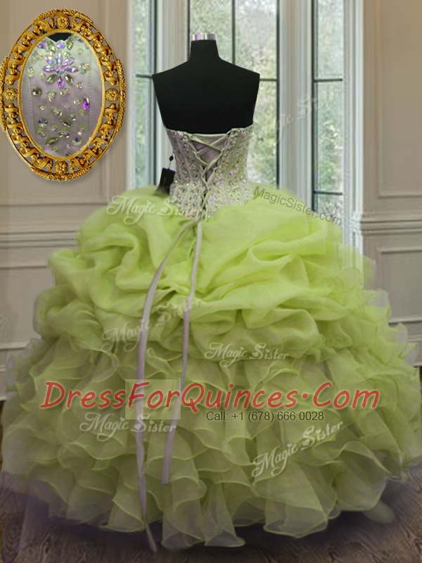 Sleeveless Organza Floor Length Lace Up Quinceanera Dress in Yellow Green with Beading and Pick Ups