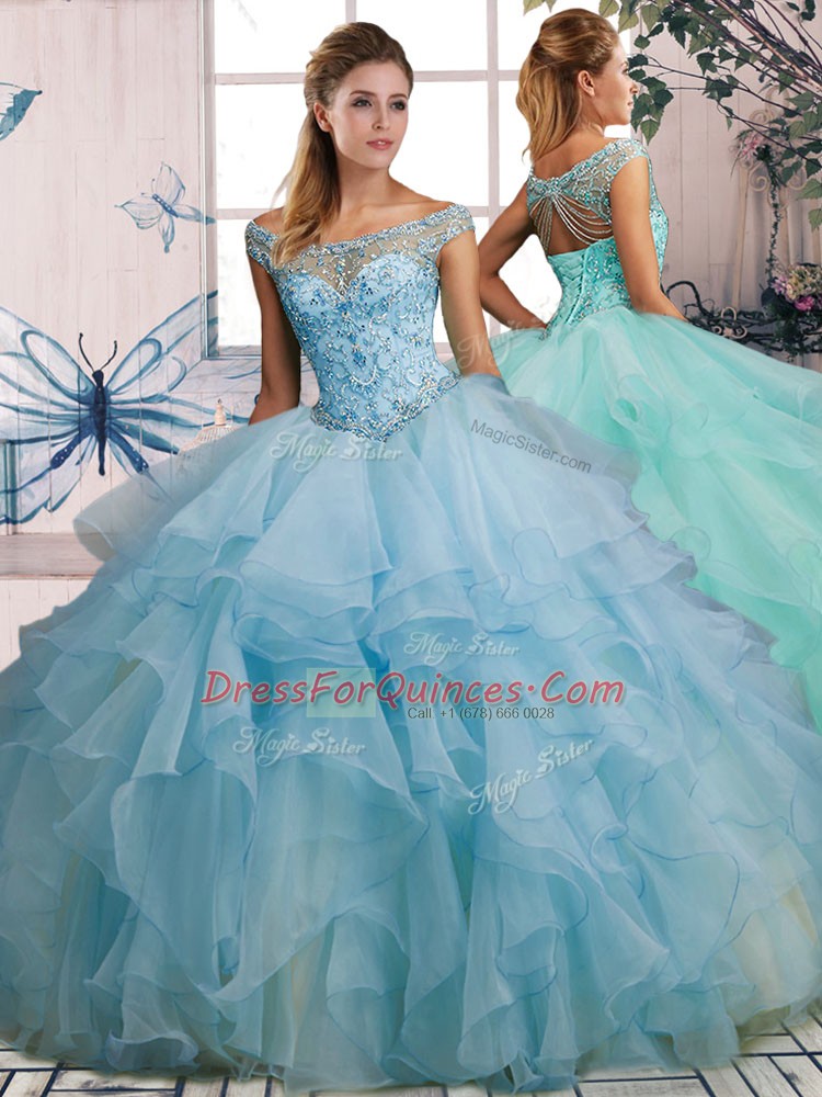 Sleeveless Organza Floor Length Lace Up Quinceanera Gowns in Light Blue with Beading and Ruffles