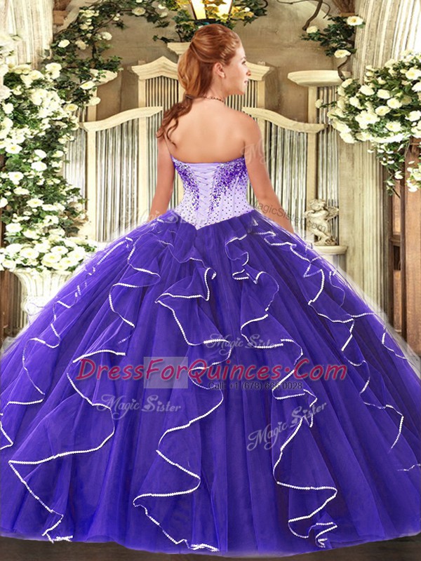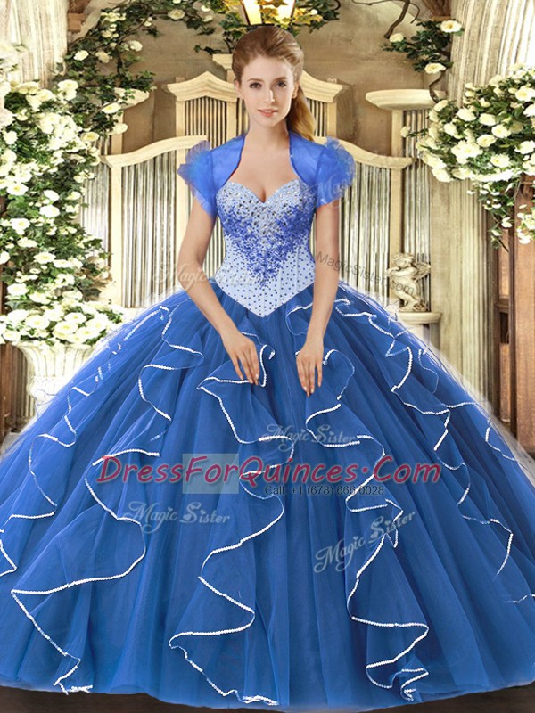 Tulle Sweetheart Cap Sleeves Lace Up Beading 15th Birthday Dress in Blue