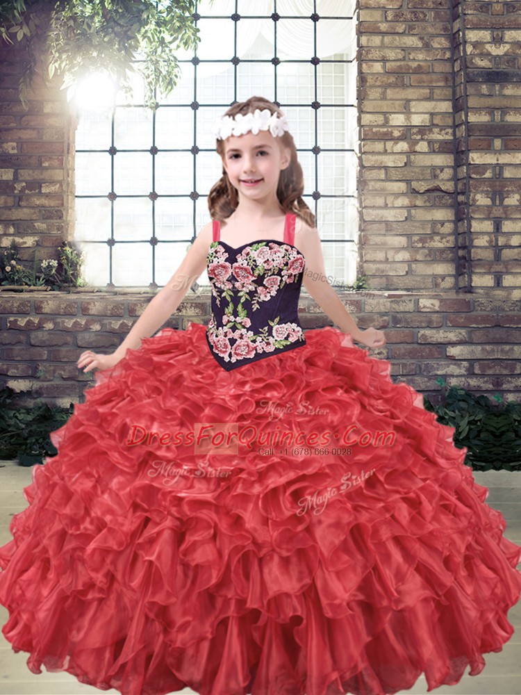 Attractive Red Ball Gowns Straps Sleeveless Organza Floor Length Lace Up Embroidery and Ruffles Child Pageant Dress
