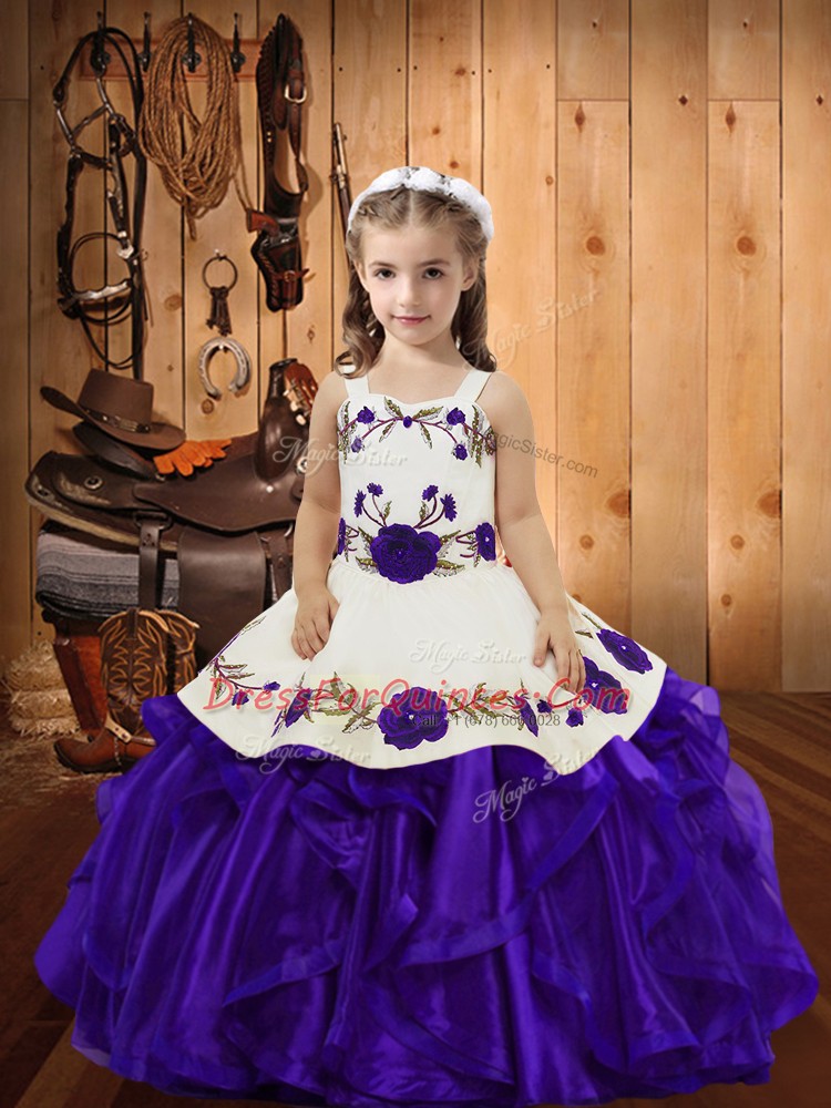 Elegant Purple Ball Gowns Embroidery and Ruffles Little Girl Pageant Gowns Lace Up Organza Sleeveless Floor Length