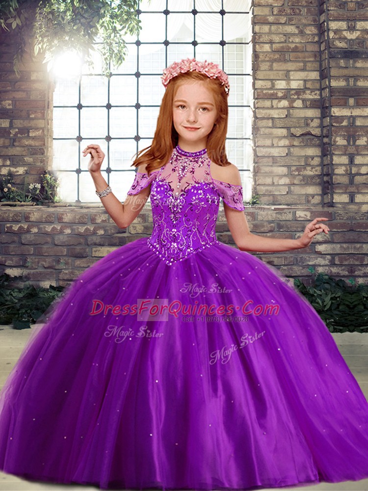 Fancy Tulle High-neck Sleeveless Lace Up Beading Little Girls Pageant Dress Wholesale in Purple