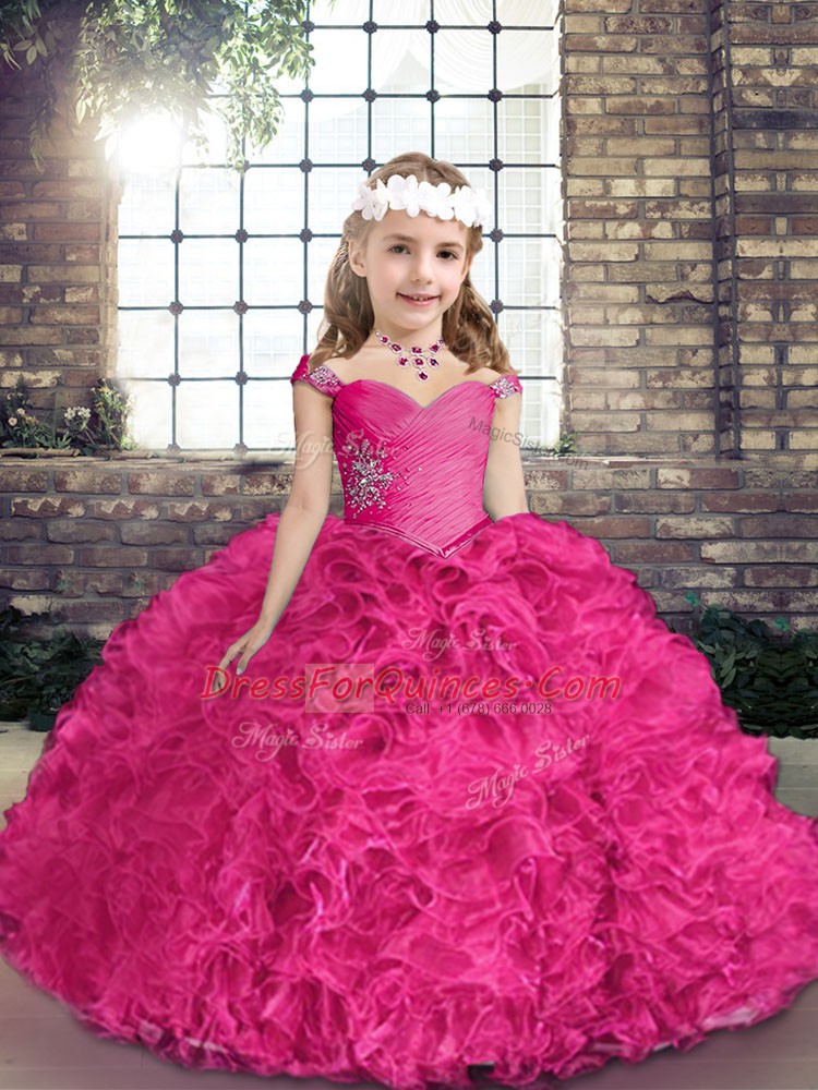Floor Length Fuchsia Little Girls Pageant Dress Wholesale Straps Sleeveless Lace UpFloor Length Fuchsia Little Girls Pageant Dress Wholesale Straps Sleeveless Lace Up