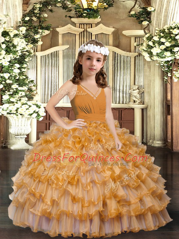 Gold Zipper V-neck Ruffles and Ruffled Layers Little Girls Pageant Dress Organza Sleeveless