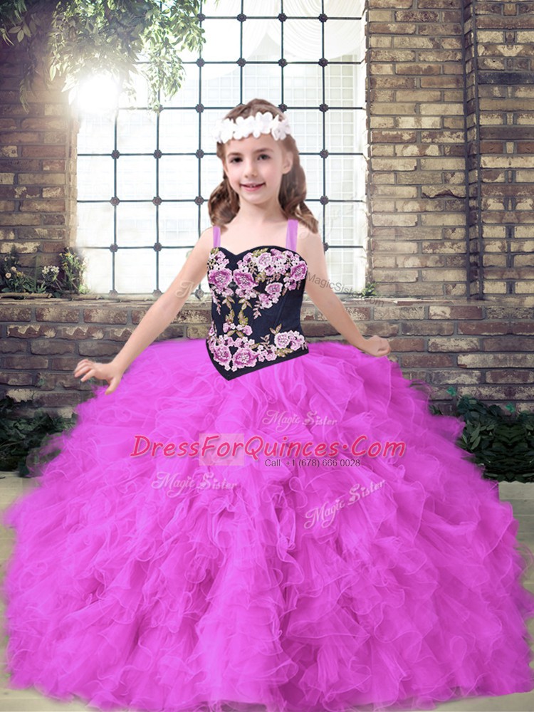 Modern Fuchsia Ball Gowns Straps Sleeveless Tulle Floor Length Lace Up Embroidery and Ruffles Child Pageant Dress