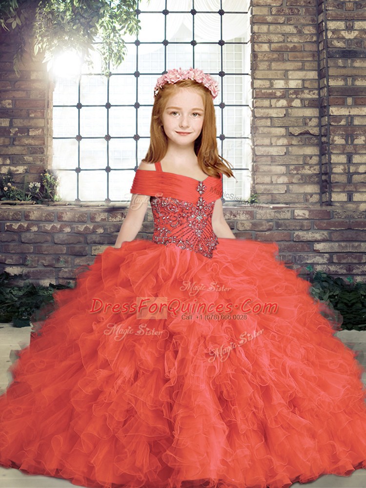 Red Lace Up Straps Beading Little Girl Pageant Gowns Tulle Sleeveless