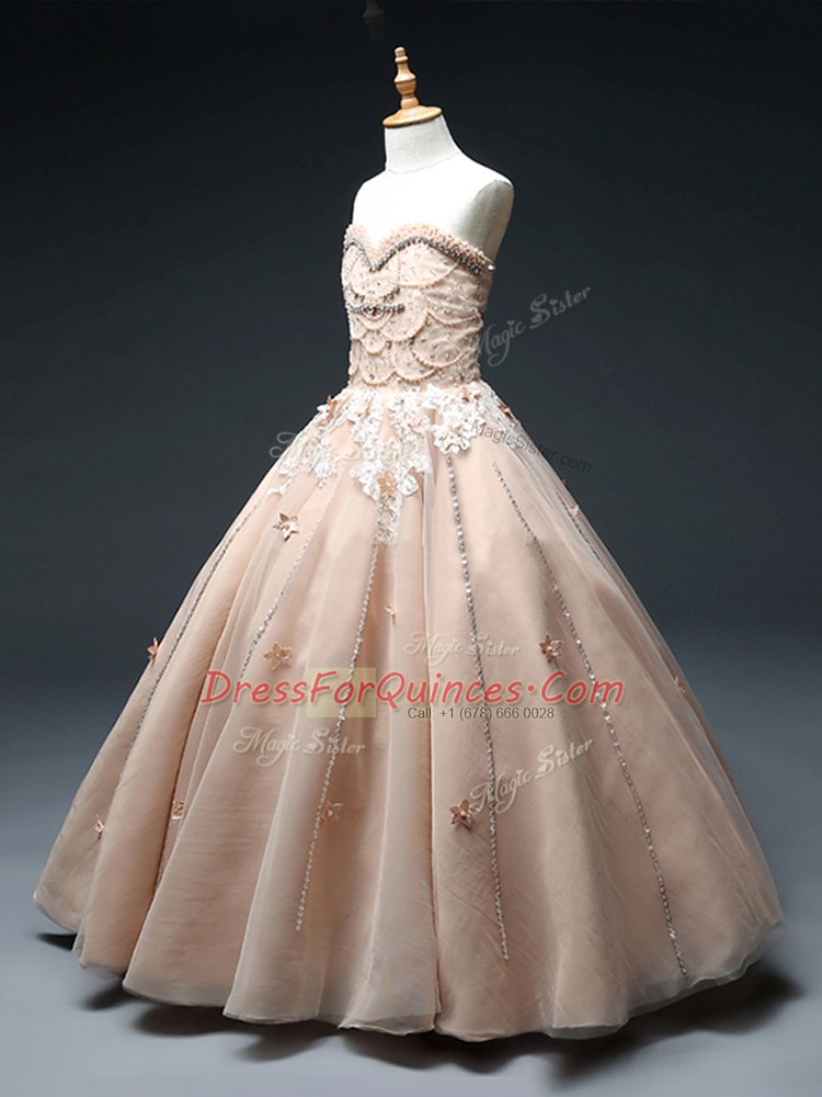 Sleeveless Floor Length Beading and Appliques Lace Up Little Girls Pageant Dress with Pink