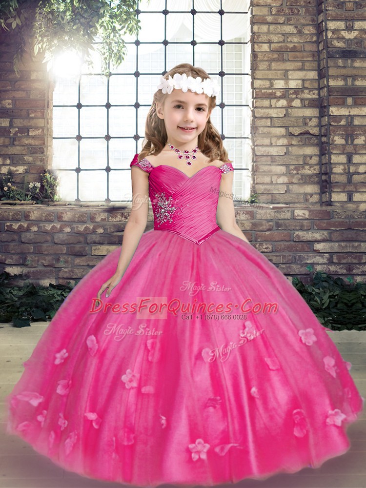 Sleeveless Floor Length Beading and Hand Made Flower Lace Up Little Girl Pageant Gowns with Hot Pink