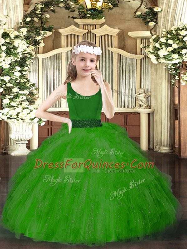 Stunning Floor Length Green Little Girl Pageant Gowns Tulle Sleeveless Beading and Ruffles