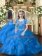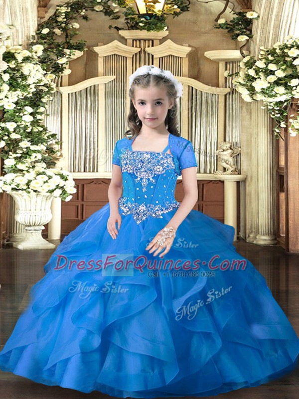 Trendy Floor Length Lace Up Little Girl Pageant Dress Blue for Military Ball and Wedding Party with Beading and Ruffles