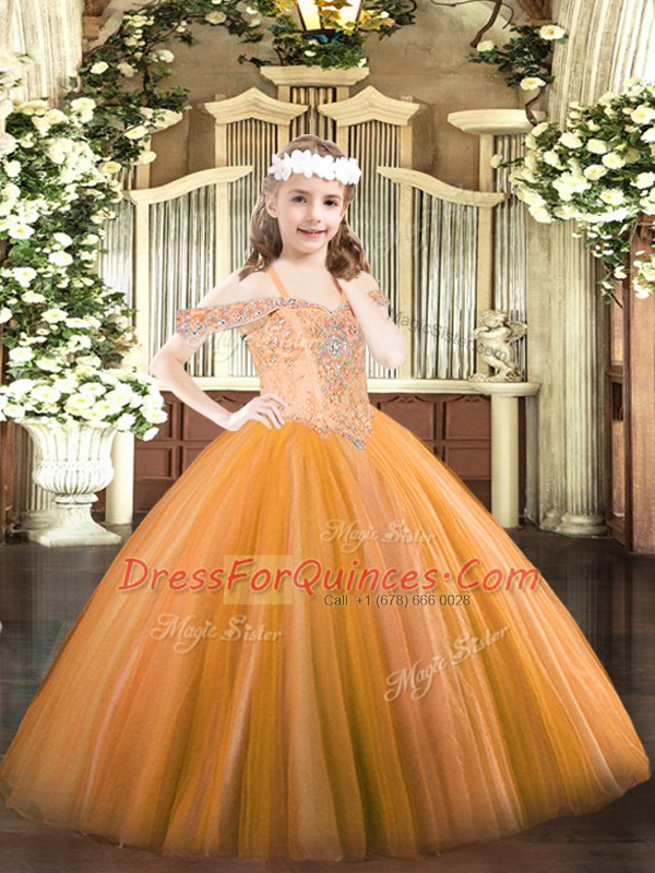 Unique Floor Length Orange Kids Pageant Dress Off The Shoulder Sleeveless Lace Up