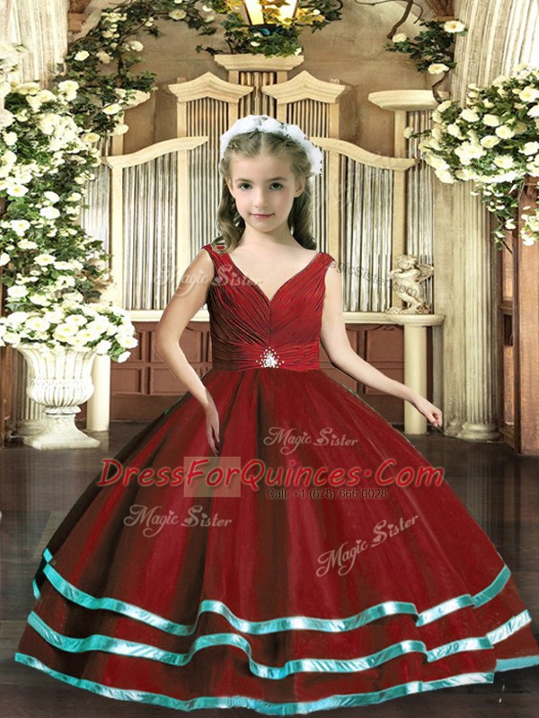 Wine Red Organza Backless V-neck Sleeveless Floor Length Girls Pageant Dresses Beading and Ruching