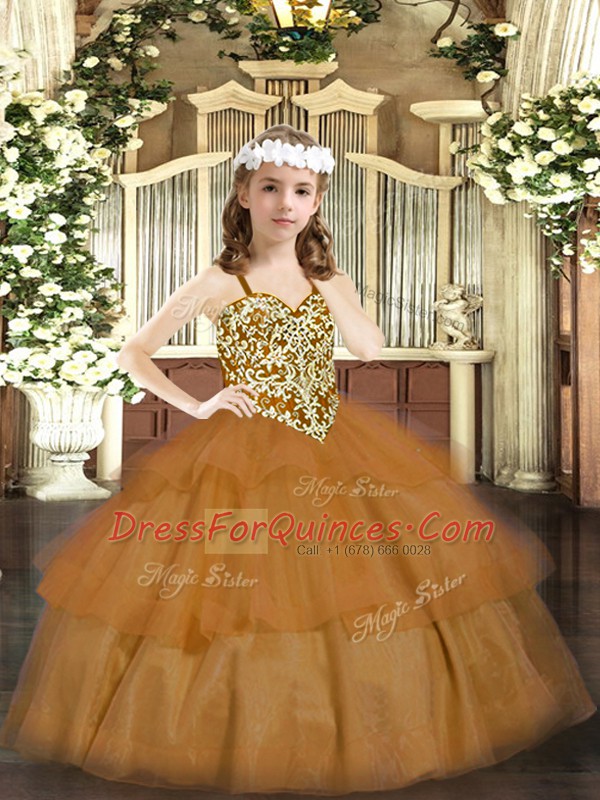 Wonderful Brown Sleeveless Beading and Ruffled Layers Floor Length Little Girls Pageant Gowns