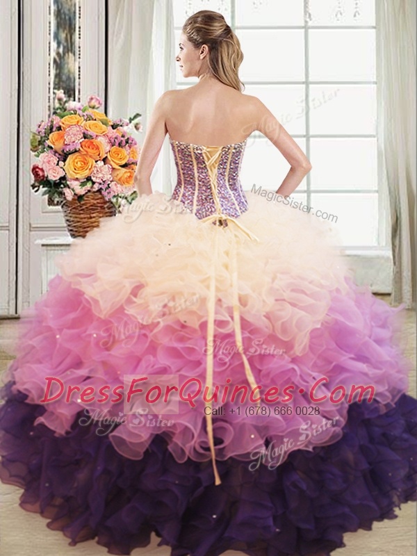 Artistic Sweetheart Sleeveless Ball Gown Prom Dress Floor Length Beading and Ruffles Multi-color Organza