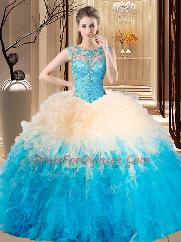 Backless Tulle Sleeveless Floor Length Sweet 16 Dresses and Beading and Ruffles