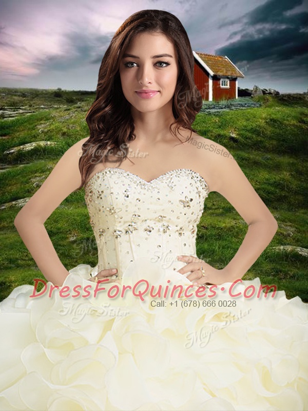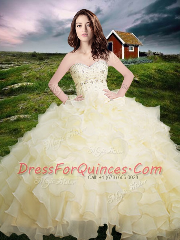 Best Selling Sleeveless Floor Length Beading and Ruffled Layers Lace Up Quinceanera Gown with Light Yellow