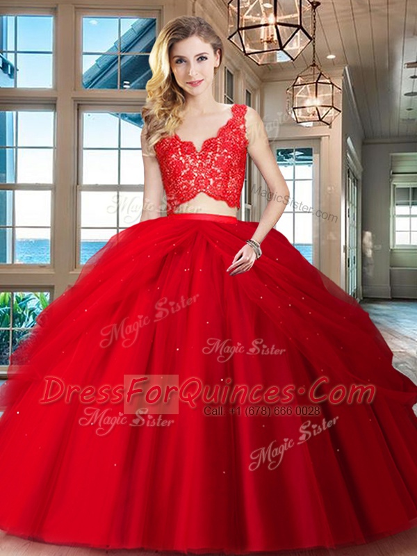 Best Selling Tulle V-neck Sleeveless Zipper Lace and Ruffled Layers 15th Birthday Dress in Red