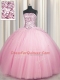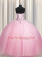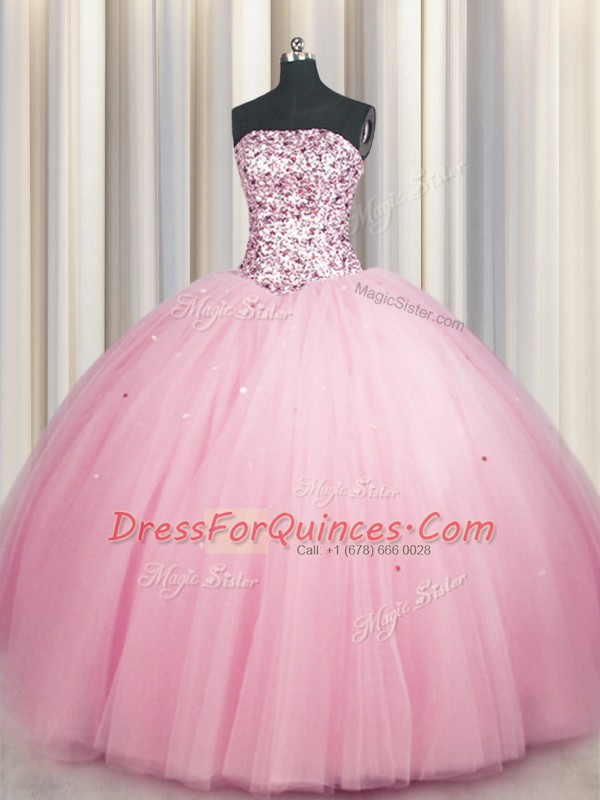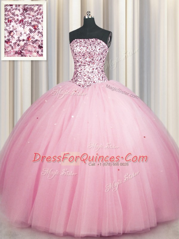Big Puffy Pink Tulle Lace Up Strapless Sleeveless Floor Length Ball Gown Prom Dress Sequins