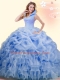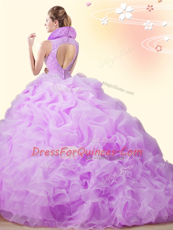 Blue Organza Backless Ball Gown Prom Dress Sleeveless Brush Train Beading and Ruffles and Pick Ups