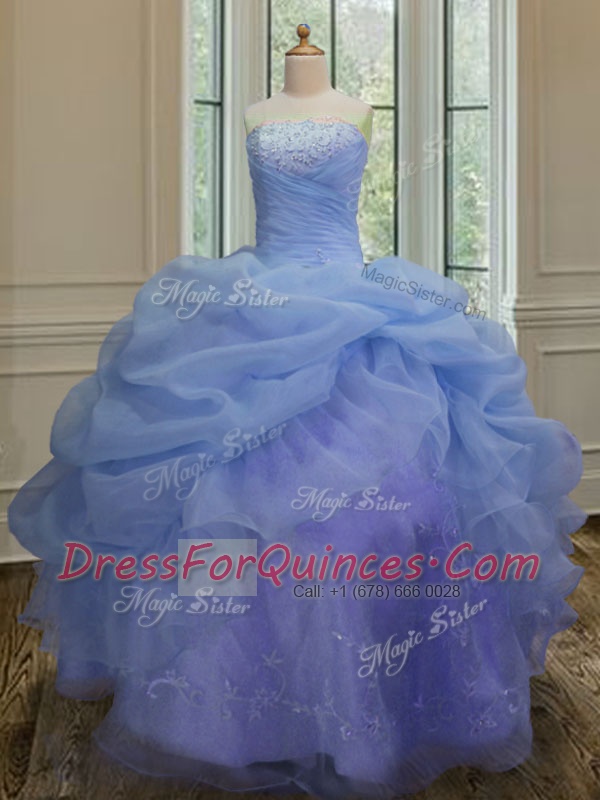Blue Organza Lace Up Sweet 16 Dress Sleeveless Floor Length Embroidery and Pick Ups