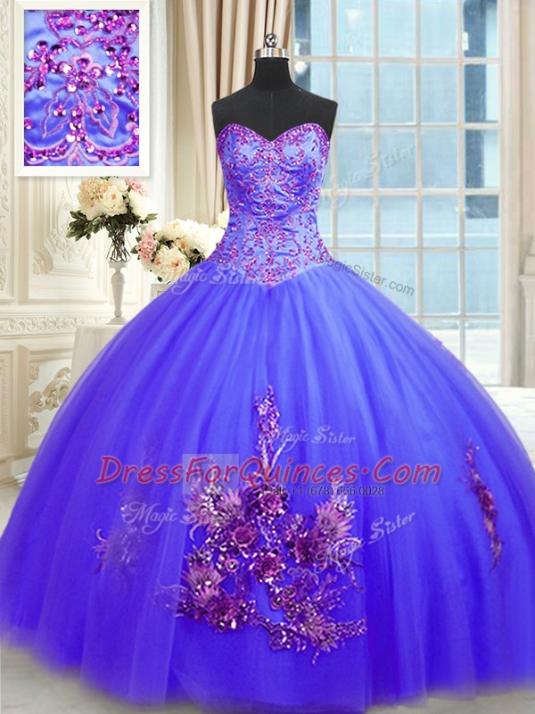 Blue Sleeveless Tulle Lace Up Ball Gown Prom Dress for Military Ball and Sweet 16 and Quinceanera
