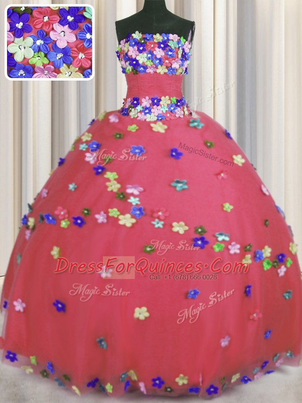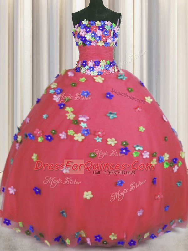 Charming Coral Red Tulle Lace Up Sweet 16 Dress Sleeveless Floor Length Hand Made Flower