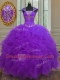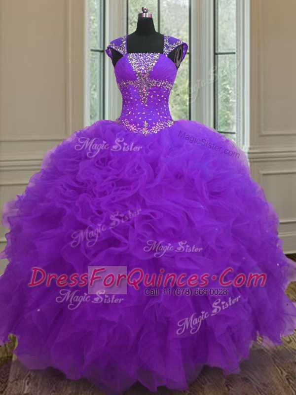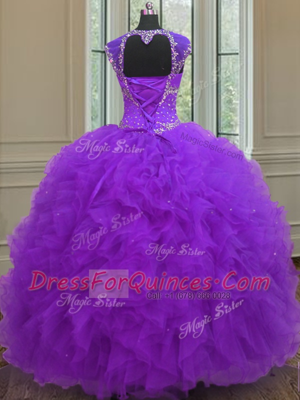 Charming Purple Lace Up Straps Beading and Ruffles and Sequins Sweet 16 Dress Organza Cap Sleeves