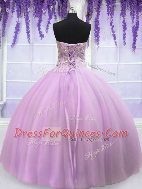 Cute Floor Length Lilac 15th Birthday Dress Tulle Sleeveless Beading