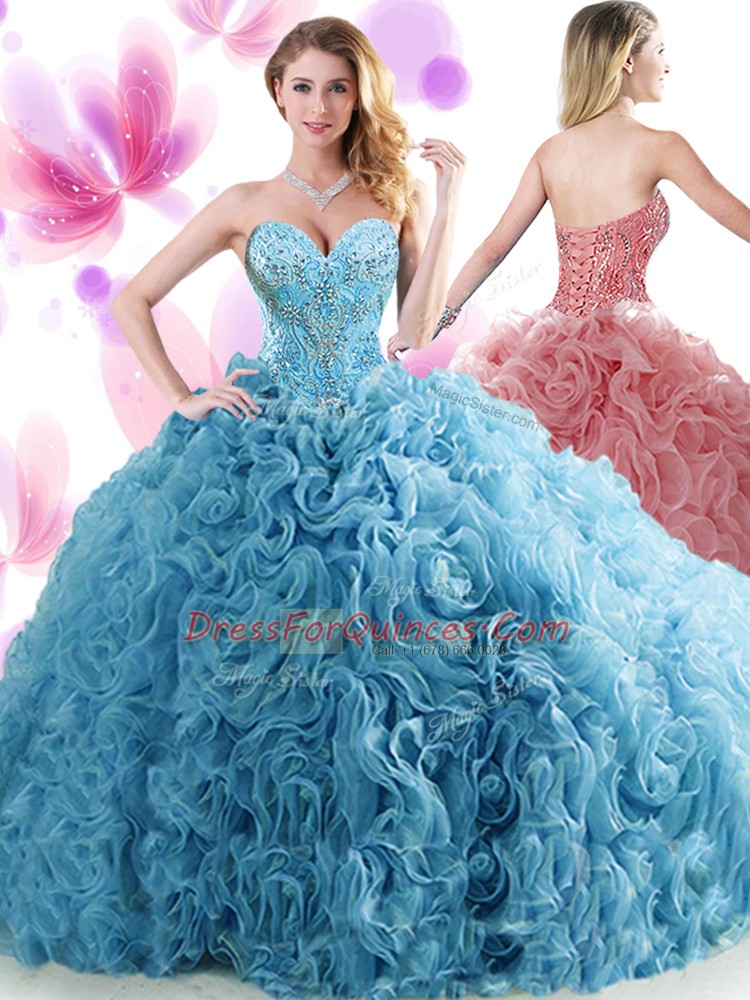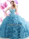 Elegant Blue Ball Gown Prom Dress Organza Brush Train Sleeveless Beading and Ruffles