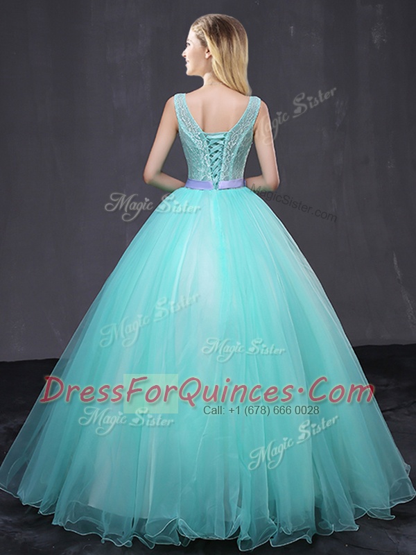 Elegant Scoop Floor Length Lace Up Ball Gown Prom Dress Aqua Blue for Military Ball and Sweet 16 and Quinceanera with Appliques and Belt