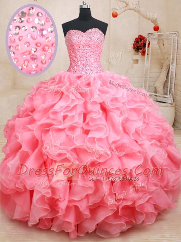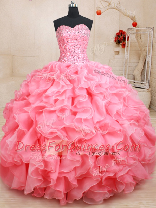 Fabulous Pink Organza Lace Up Sweetheart Sleeveless Floor Length Quinceanera Gown Beading and Ruffles