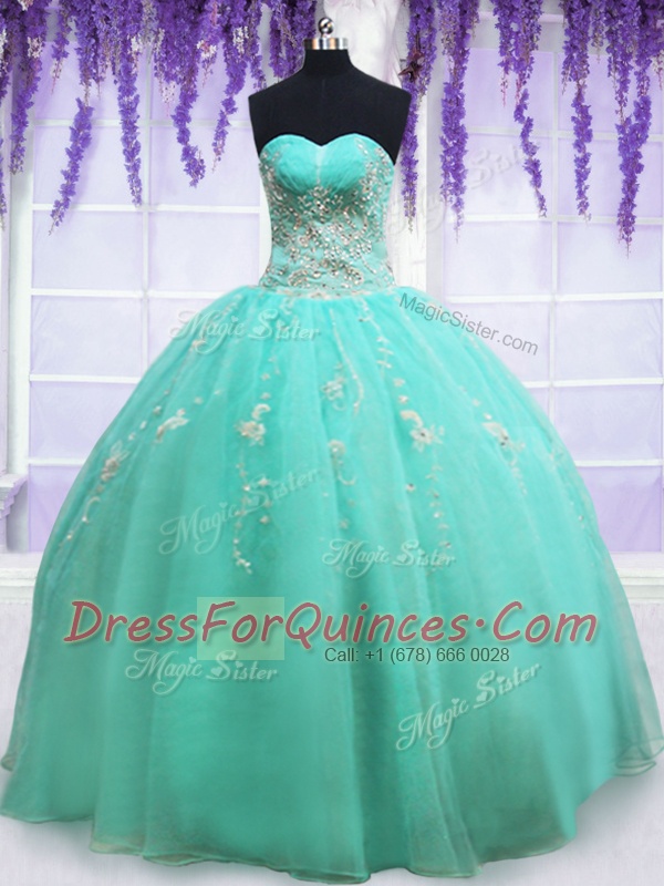 Fancy Apple Green Ball Gowns Organza Sweetheart Sleeveless Beading and Appliques Floor Length Zipper 15th Birthday Dress