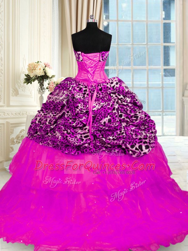 Fantastic Printed Beading and Ruffled Layers and Sequins Sweet 16 Dress Fuchsia Lace Up Sleeveless Sweep Train