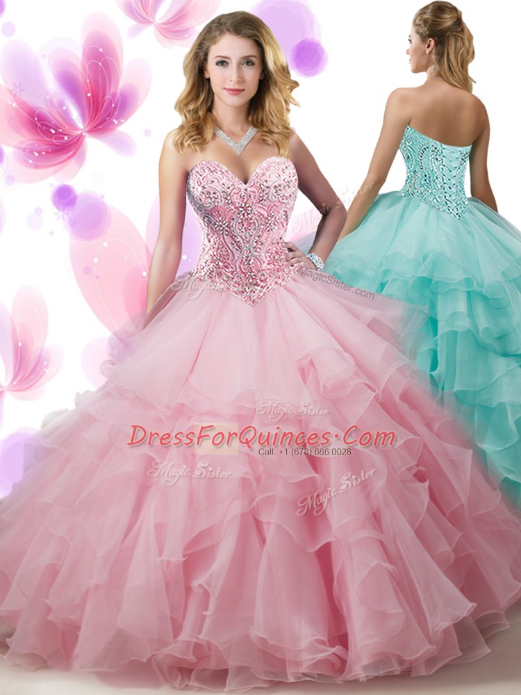 Fantastic Sleeveless Organza Floor Length Lace Up Sweet 16 Quinceanera Dress in Pink with Beading and Ruffled Layers