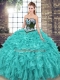 Fashion Turquoise Ball Gowns Embroidery and Ruffles 15th Birthday Dress Lace Up Organza Sleeveless
