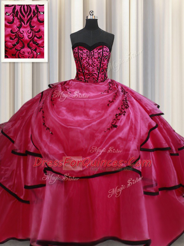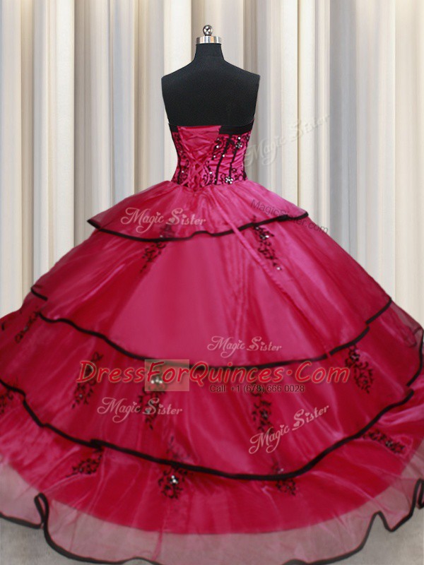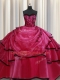 Flare Floor Length Red Quince Ball Gowns Satin Sleeveless Beading and Appliques and Ruffled Layers