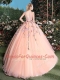 Flirting Peach Tulle Lace Up Quinceanera Dresses Sleeveless With Brush Train Appliques