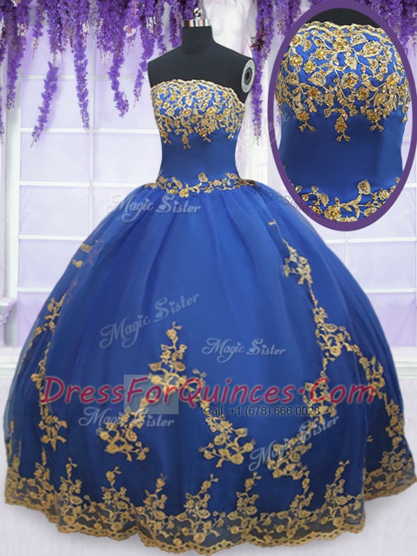 Floor Length Blue Ball Gown Prom Dress Organza Sleeveless Appliques
