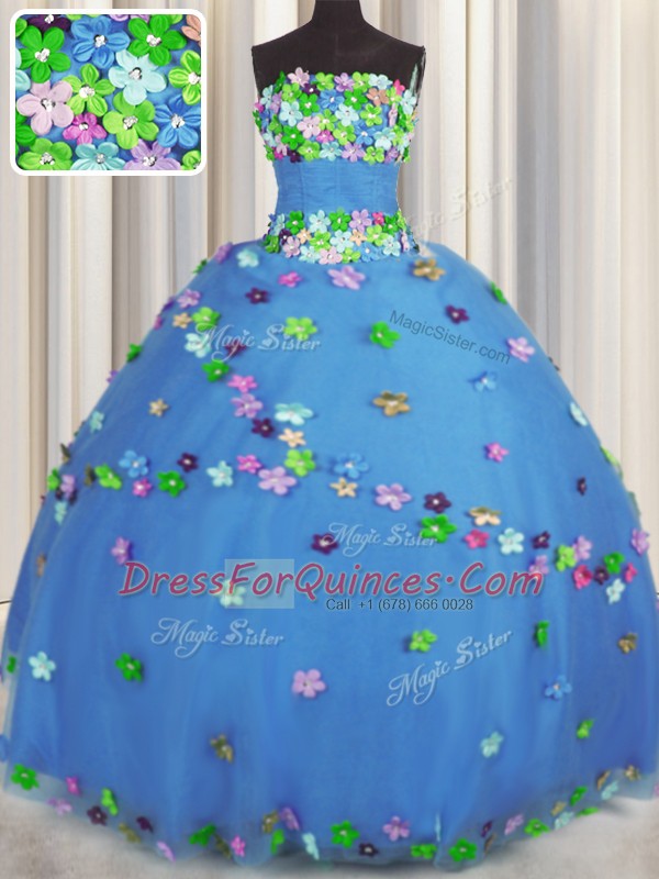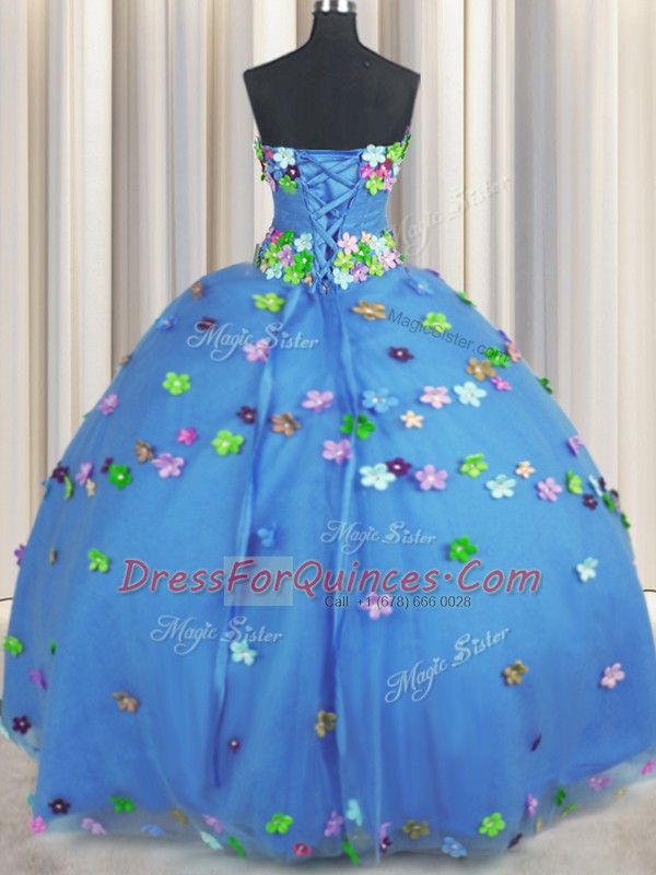 Floor Length Lace Up Ball Gown Prom Dress Blue for Military Ball and Sweet 16 and Quinceanera with Hand Made Flower