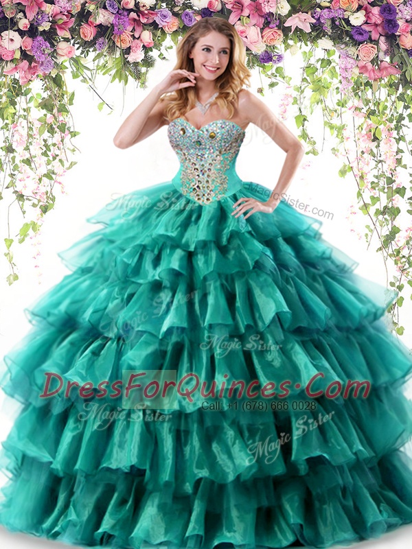 Floor Length Lace Up Quince Ball Gowns Green for Military Ball and Sweet 16 and Quinceanera with Beading and Ruffled Layers