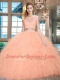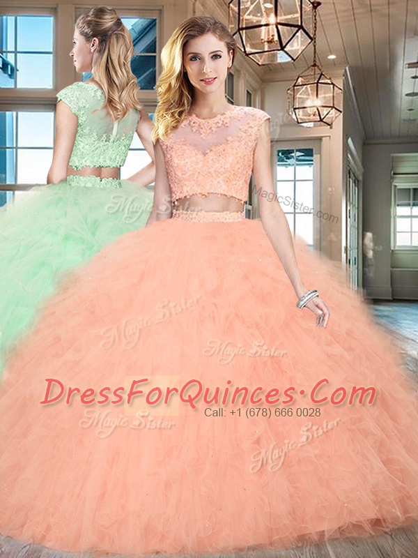 High End Scoop Tulle Cap Sleeves Floor Length Ball Gown Prom Dress and Beading and Ruffles