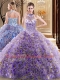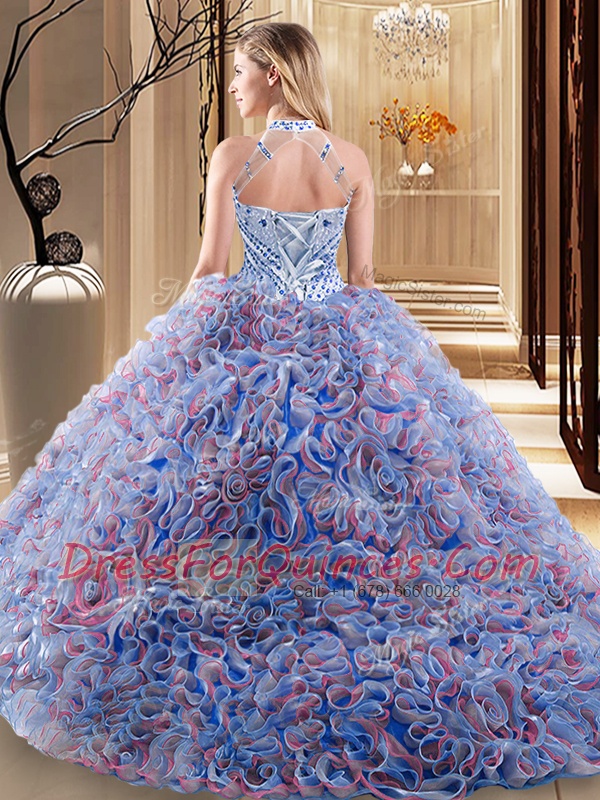 High Quality Fabric With Rolling Flowers Halter Top Sleeveless Brush Train Lace Up Beading Quinceanera Gown in Multi-color