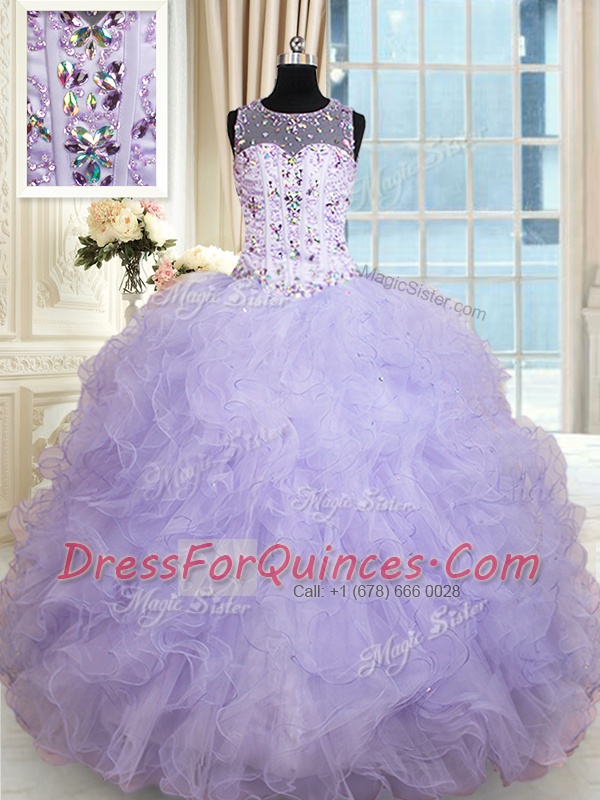Inexpensive Floor Length Lavender Quince Ball Gowns Scoop Sleeveless Lace Up