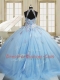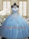 Inexpensive Light Blue High-neck Neckline Embroidery Sweet 16 Dresses Sleeveless Lace Up