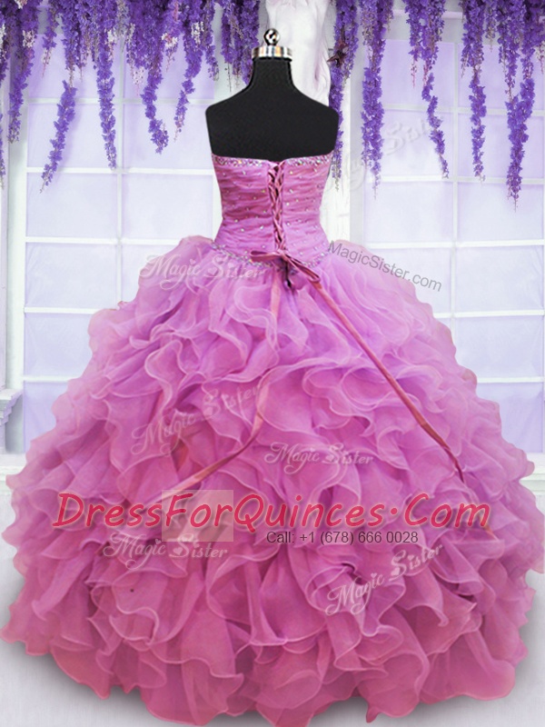 Lilac Organza Lace Up Quinceanera Dresses Sleeveless Floor Length Beading and Ruffles