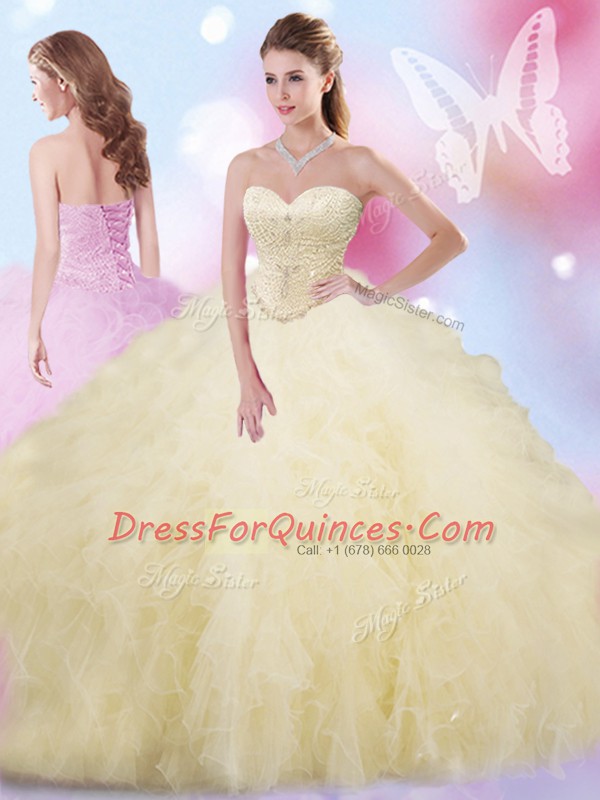 Luxurious Sleeveless Floor Length Beading and Ruffles Lace Up 15th Birthday Dress with Light Yellow